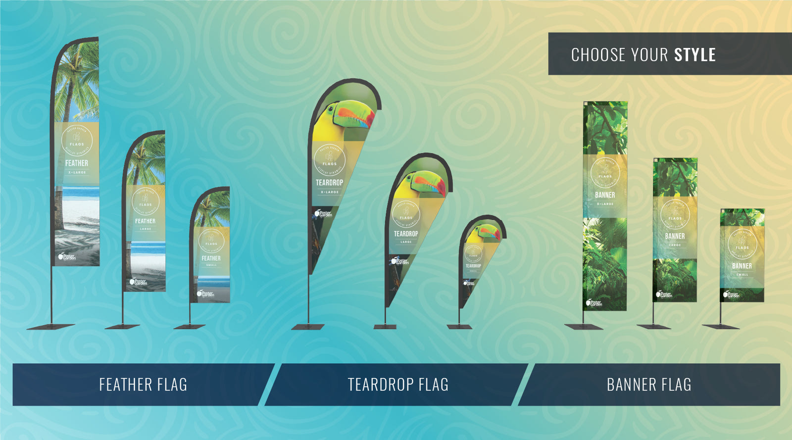 Flags range from 15' high for X-Large sizes, 10ft high for the large sizes, and 8ft high for the small sizes.