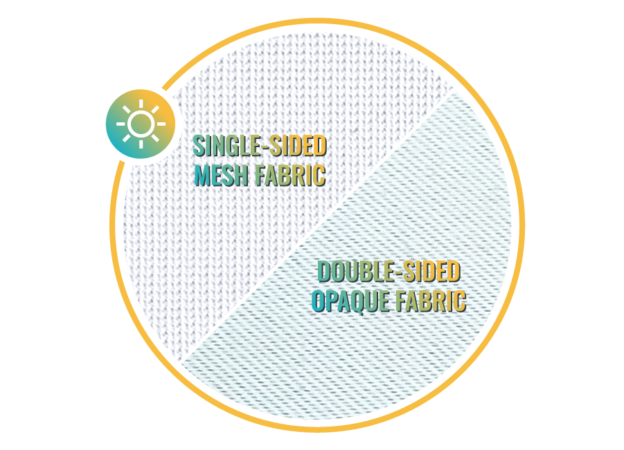 Single-sided graphics are printed on a see-through mesh fabric that allows your image to be seen on both sides. Double-sided graphics include a block-out layer allowing for different artwork printed on the front and back of the flag.