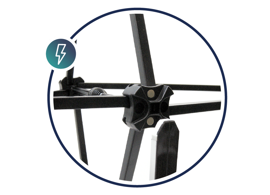 Fully magnetic hardware allows for quick assembly, reduced risk of accidental damage when collapsing the frame, and perfect graphic panel alignment.
