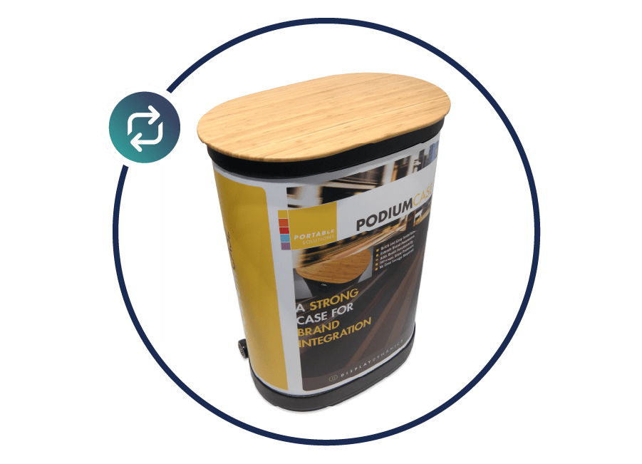 Add a natural bamboo folding wood top and laminated wrap graphic to convert the oval shipping case into a branded podium to greet your customers.