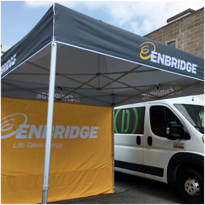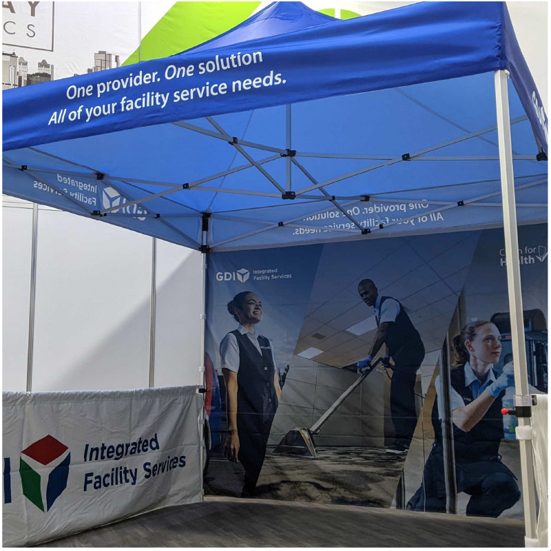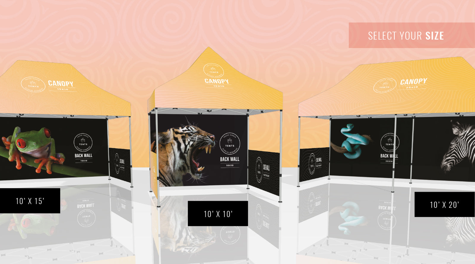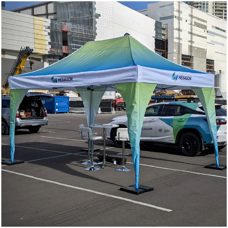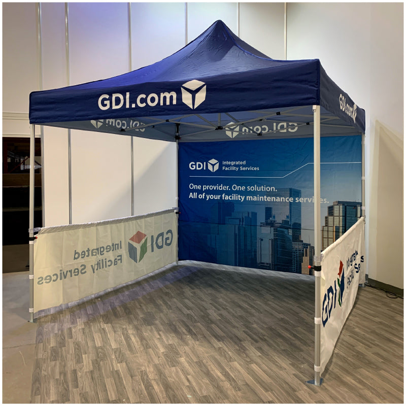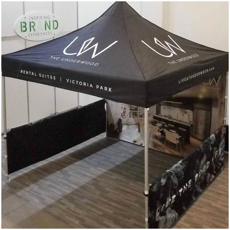 Dye-sublimated UV protected canopies with optional full and half wall hold their vibrancy for long-lasting visual impact.