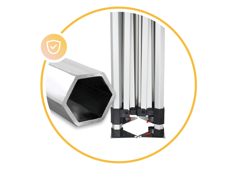 Collapsible tent frames with extendible legs, produced from commercial grade 40mm hexagonal aluminum tubing.