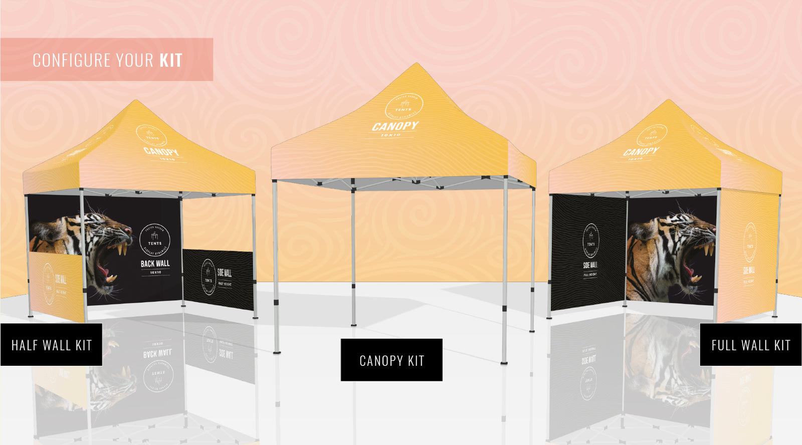 Browse our collection of 10' x 10', 10' x 15' and 10' x 20' Tent Kits. All kits include a 40mm hex aluminum tent frame with wheeled transport bag. Configurations with walls include double-sided printing by default but can be customized with single-sided printing if desired.
