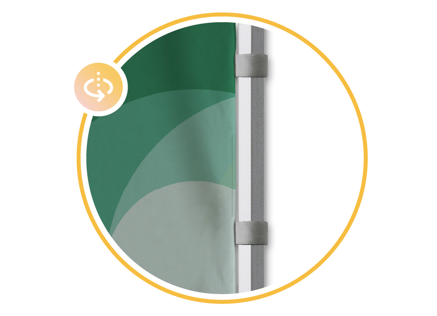 Quickly and easily apply or remove your wall panels based on weather conditions. Full wall graphics attach to the canopy with velcro strips, and both full and half wall graphics are secured to the frame legs with velcro loops.