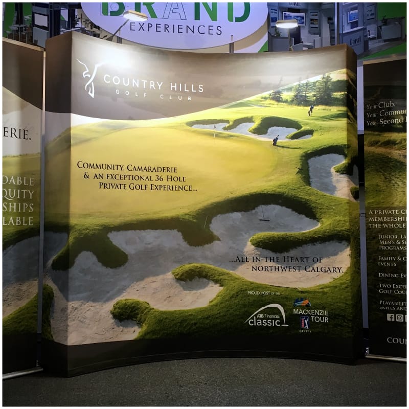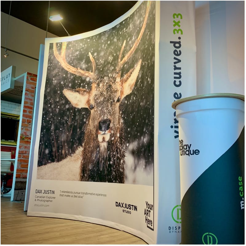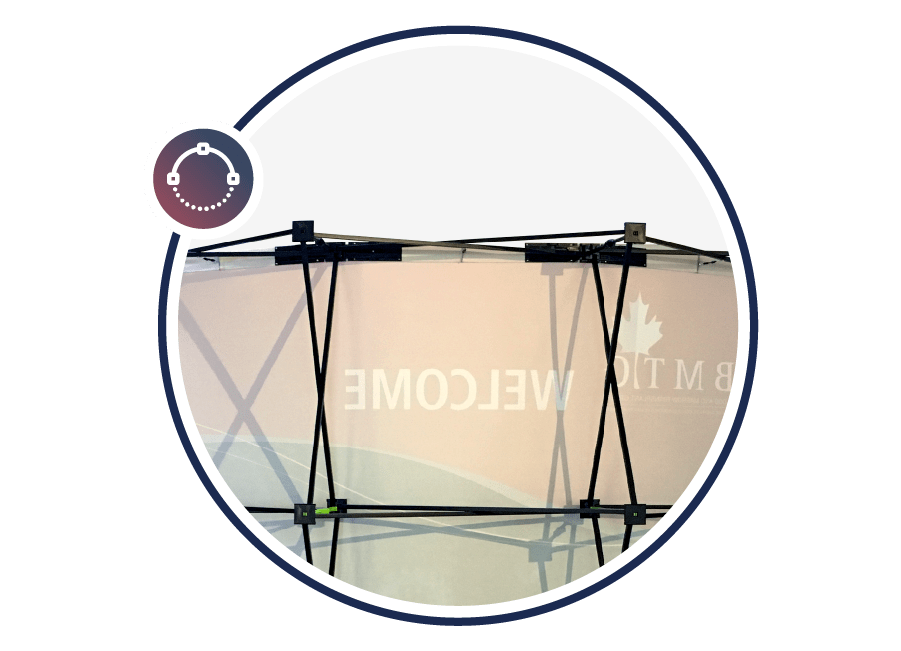 High-definition fabric graphic is held taught to the curved frame with self-fastening hardware. The graphic is machine washable & easy to replace.
