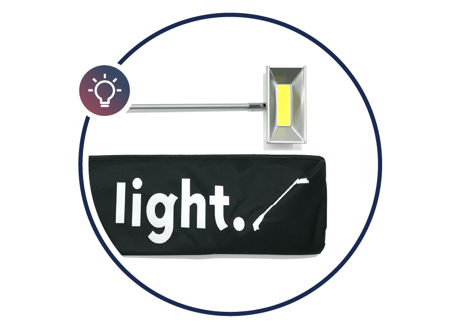 Modern silver LED spotlights ensure that your message stands-out. Convenient padded bags included to safely pack them with your display.