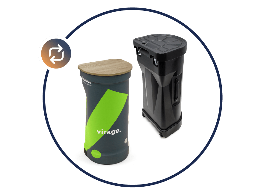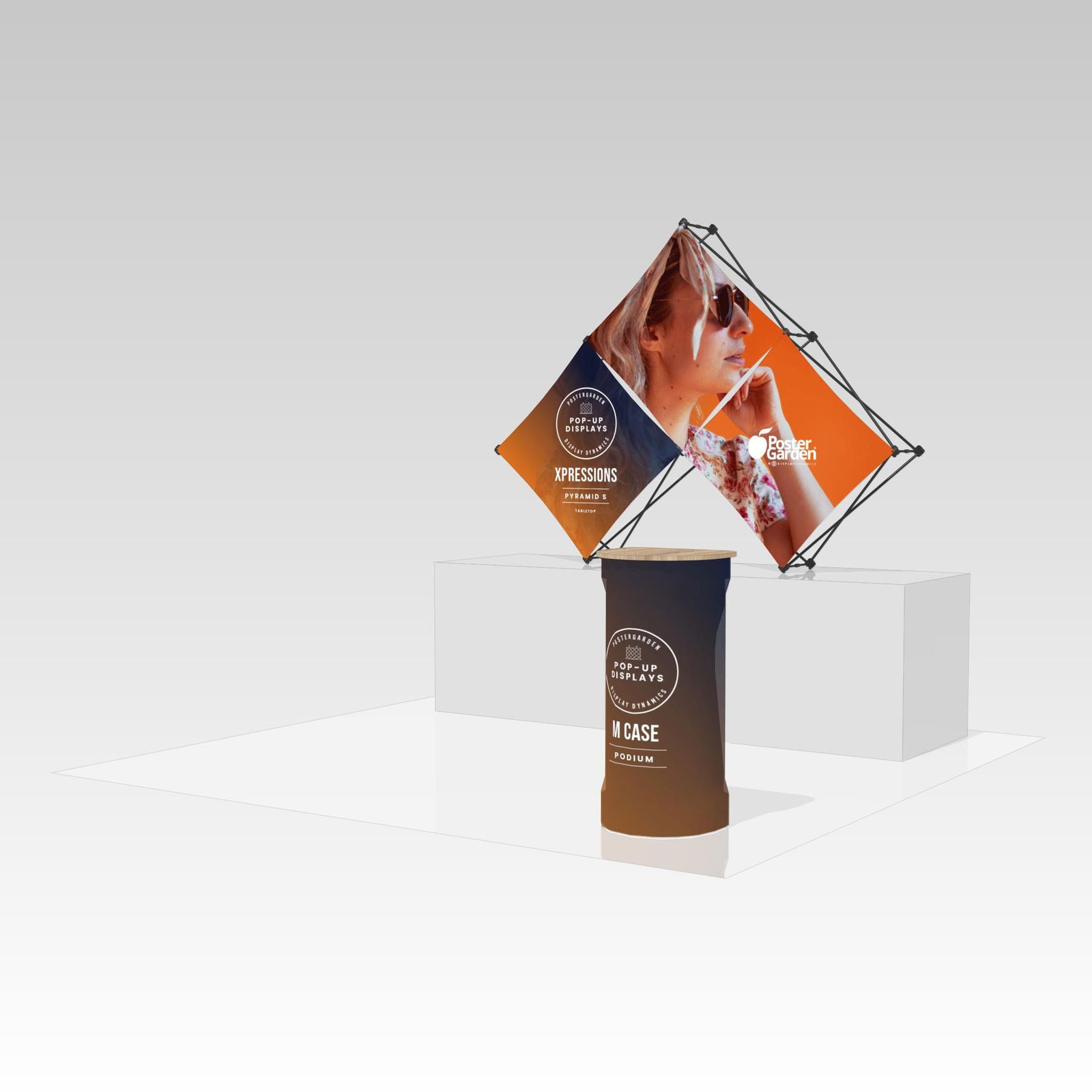 The folding gray woodgrain countertop and fabric graphic cover easily transforms the wheeled L or M Case into a convenient podium.