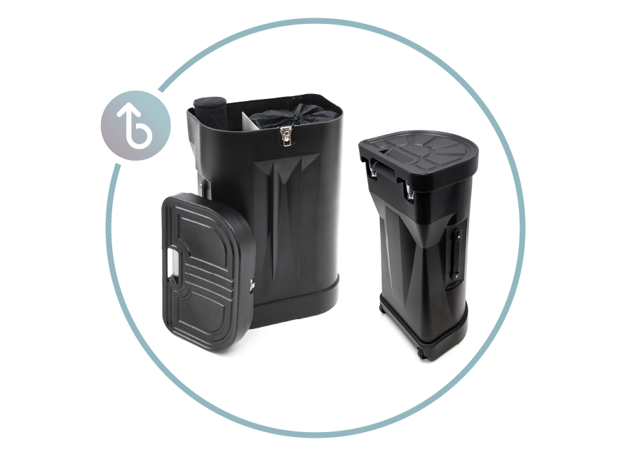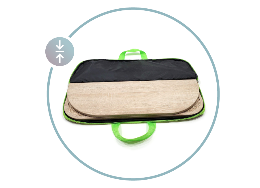 A durable wood countertop folds in half and is protected by the included padded sleeve.