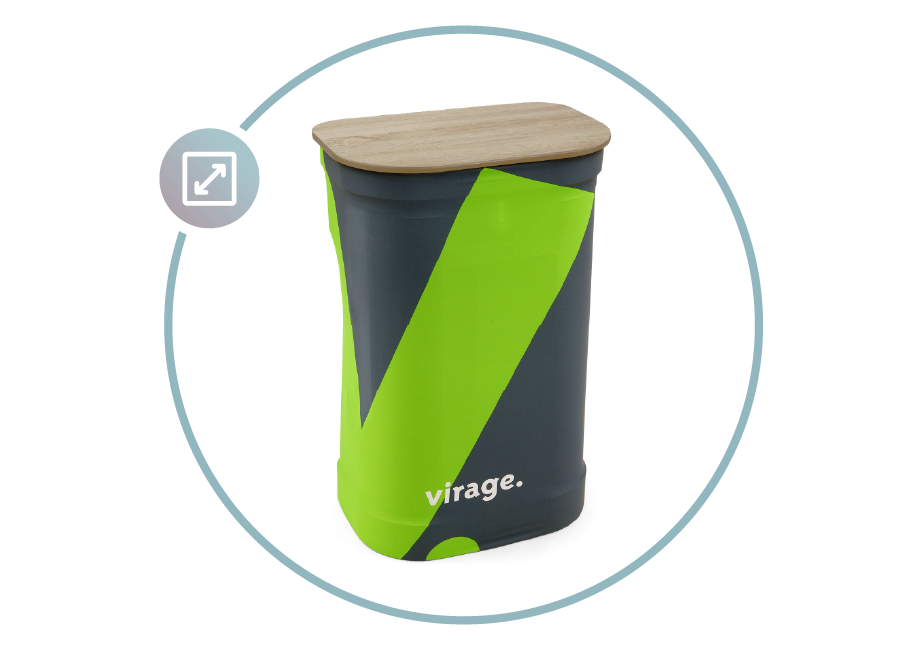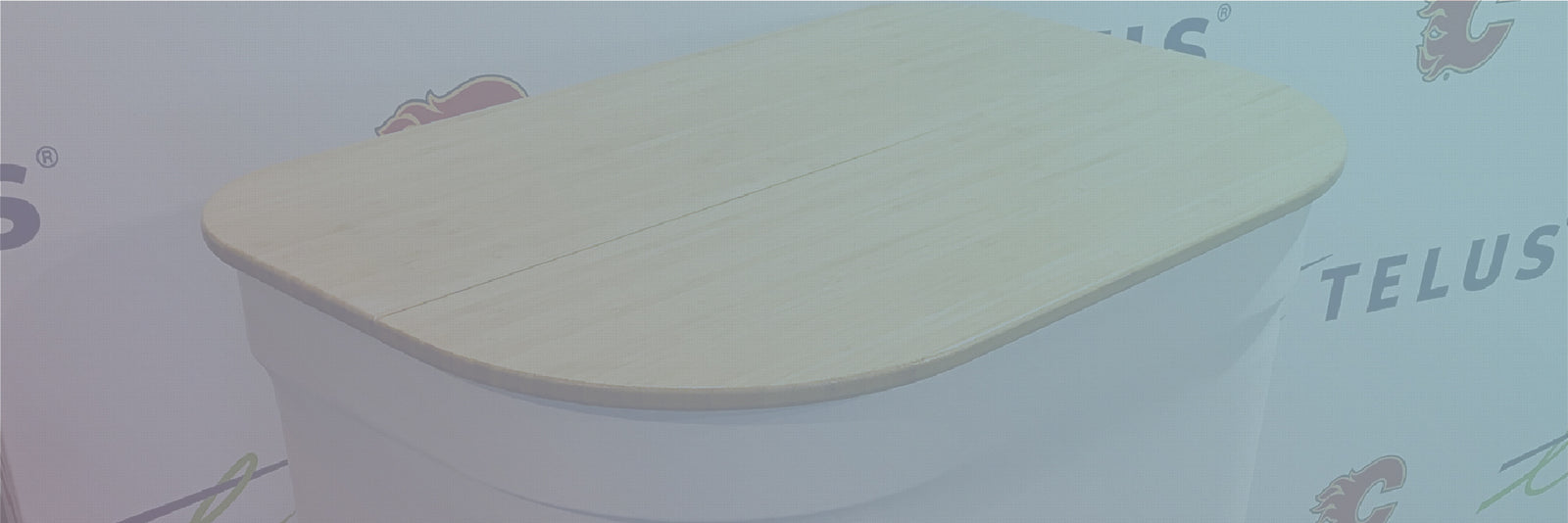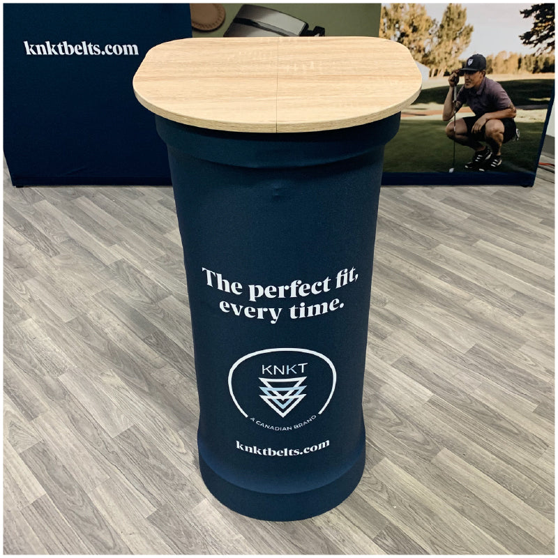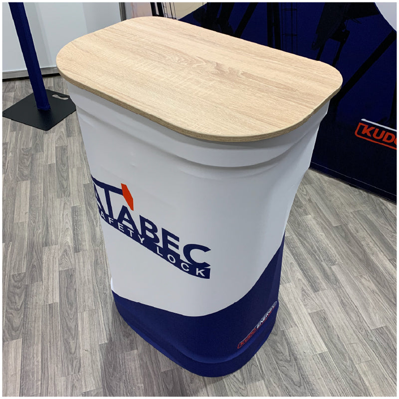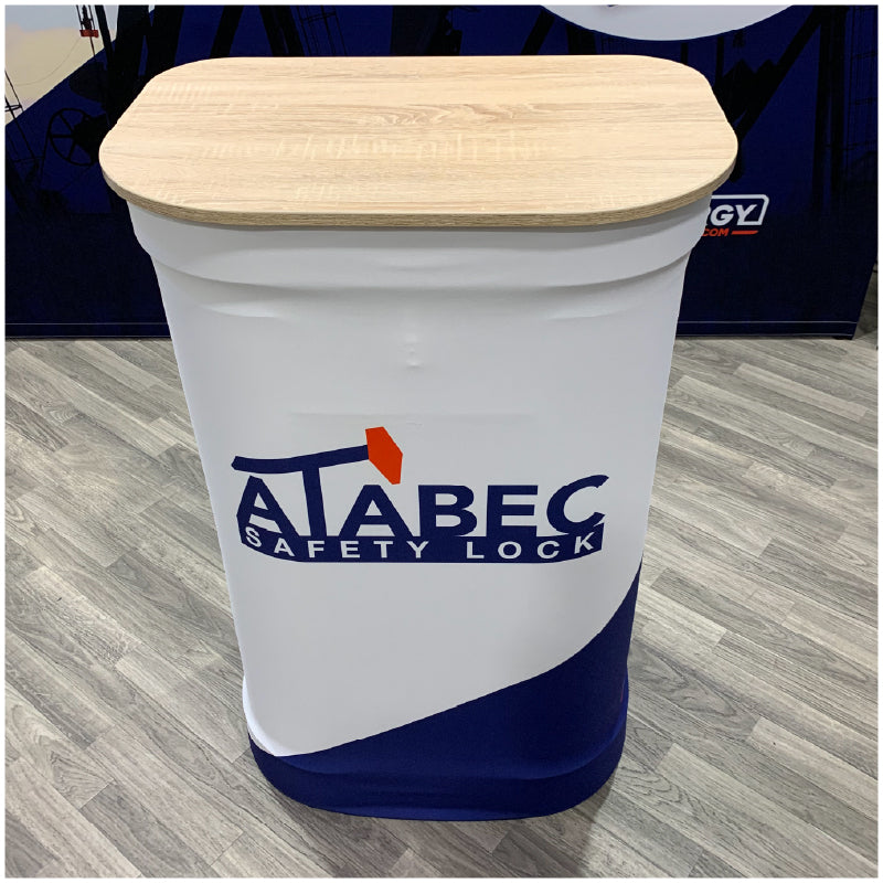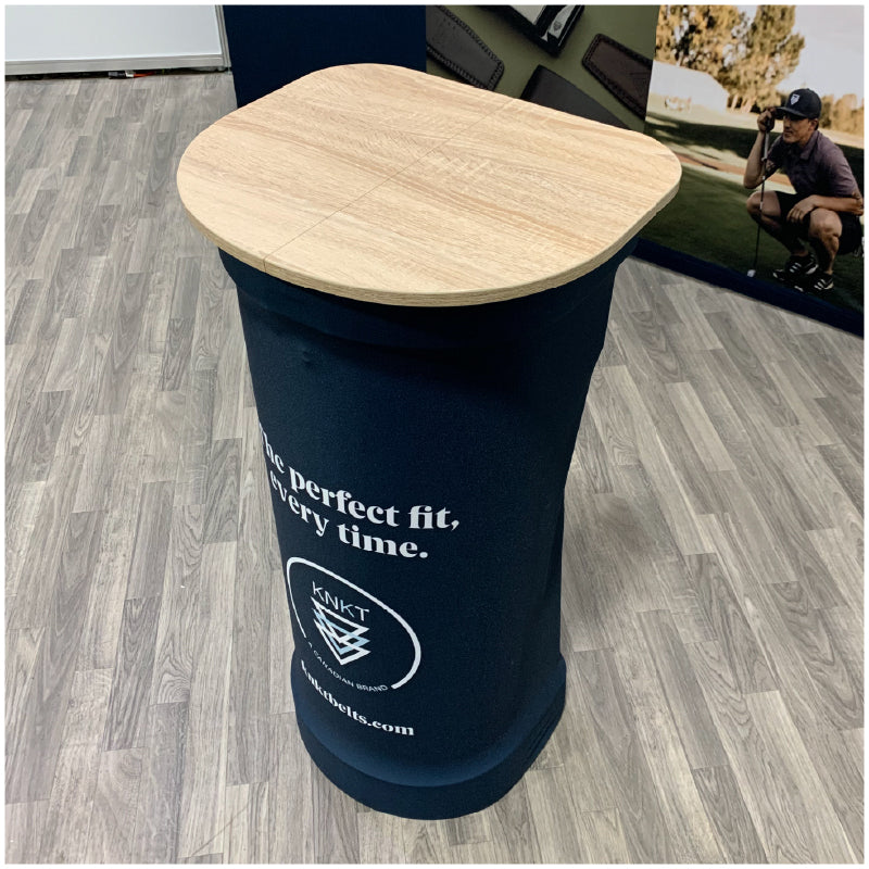 A custom printed fabric covering stretches over the case to create a personalized podium.
