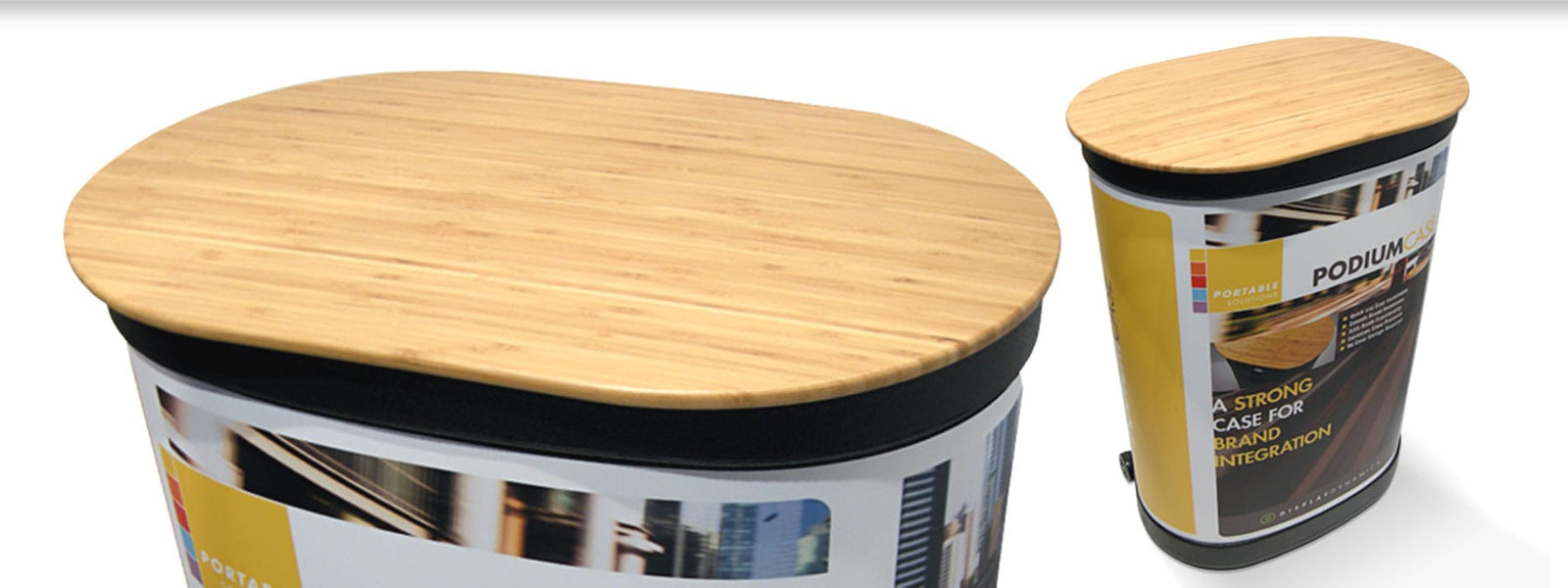 Add a natural bamboo folding wood top and laminated wrap graphic to convert the oval shipping case into a branded podium to greet your customers.